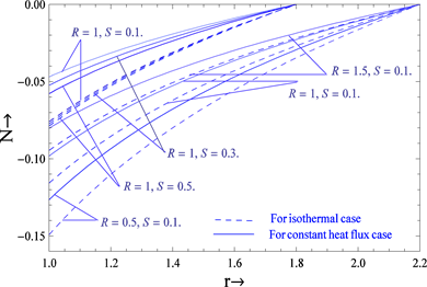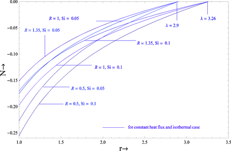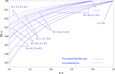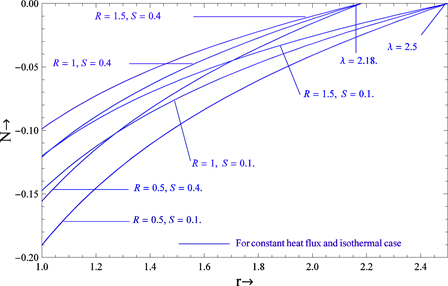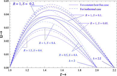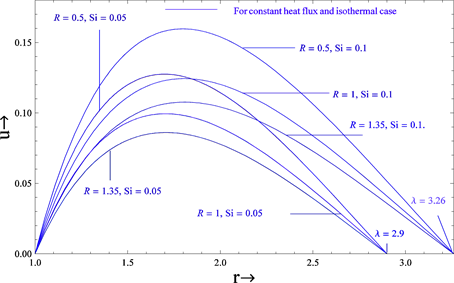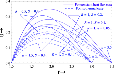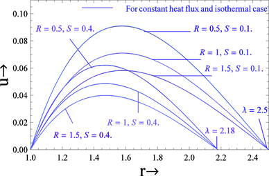 Graphical representation in Figures 1-3 shows the variation of the velocity profiles with source, vertex viscosity and gap between the cylinders for both cases such as constant heat flux and isothermal. It is clear from these figures that the velocity of the fluid increases when the source and gap between the cylinders increases for both cases. When , the velocity is greater for the constant heat flux case compared to the isothermal case while reverse phenomenon occurs when . In light of this effect, we obtain the critical value of at which the velocity profiles are the same for both cases. The nature of the velocity of the fluid is almost the same for constant heat flux and isothermal cases when the critical value of . The critical values 2.5 and 2.18 of corresponding to and 0.4, clearly show that the effect of source parameter is to decrease it. As in the case above, the velocity of the fluid decreases with increasing vertex viscosity parameters for both cases.