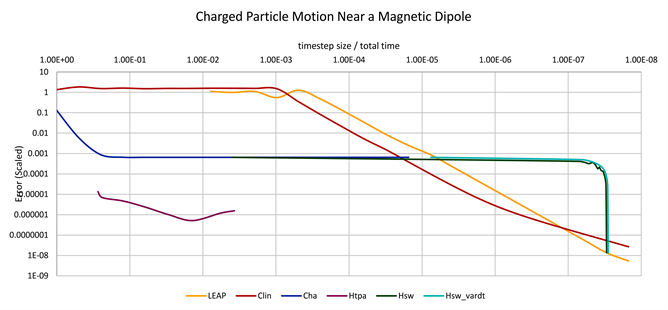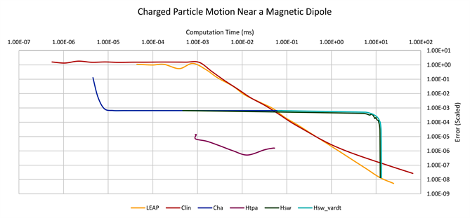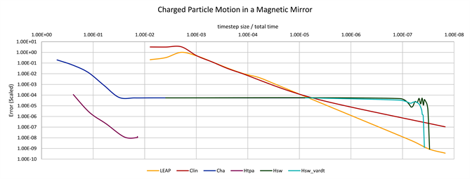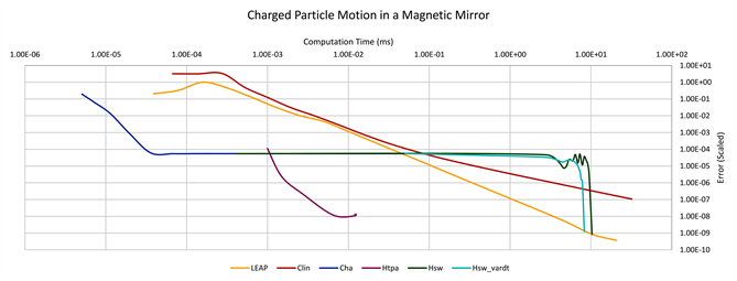 Particle trajectories for these examples are shown in Figure 1. Simulations were performed using 6 different schemes for both examples to assess accuracy and computation time (Figure 2). The simple switching hybrid method is more appropriate when the coarse propagator suitability function, , varies over several orders of magnitude; these conditions were present only for the magnetic mirror. For this example, there is a large area around the center of the magnetic mirror ( near 0) where the magnetic field is nearly constant as can be seen from Equation (49). In this area, should be a good approximation while the fine propagator, will be switched to automatically near the edges of the magnetic mirror where the field is more nonlinear.