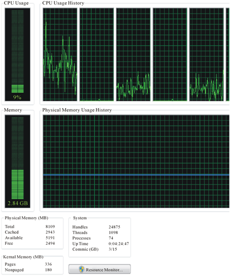 Figure 7. Shows simulations with capacity of the system along CPU usage and performance. Also processor calls and threads, by Crank Nicolson. Specification of the system is mentioned in computer applications header.