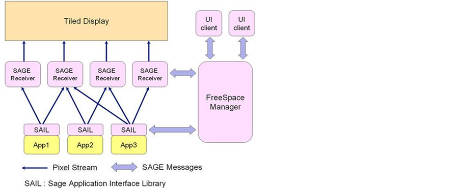 According to Renambot and Plepys, “SAGE is cross-platform, open-source middleware that enables users to have a common operating environment, or framework, to access, display and share a variety of content—whether digital cinema animations, high-resolution images, high-definition video-teleconferencing, presentation slides, documents, spreadsheets or laptop screens—in a variety of resolutions and formats, from multiple sources, to one or more tiled display walls” [7] . The purposes of the SAGE are to “support the sharing of high-resolution media and data between visualization environments or among groups of collaborators at local or remote sites. Its network-centric architecture allows collaborators to share visualizations (such as remote desktop, video streams, 2D maps, and 3D renderings) on local or remote systems” [8] .