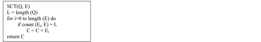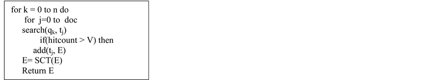 E is a special variable and deliverable of the program which holds the total expansion terms of each query term. The search (qk, tj) function compares the co-occurrence value for qk and tj, and returns the term tj if it has a hit count greater than a certain value v, where v is less than k. k is the number of relevant retrieved documents gained from the pseudo-relevance feedback. The process left the variable E with the total expansion terms of the query. E is passed to the function SCT which Selects Common Terms from E and assigns it on itself. The last step returns common expansion terms for the whole query.