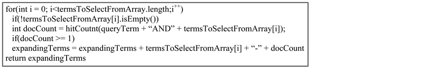 On expansion terms selection, co-occurrence frequency values of terms with the query term are analyzed, among the refined retrieved document set index. These found expansion terms for each query term is then saved separately, so that common terms found in all of the query terms can be extracted. Expanding users query using common expanding terms for the whole query has been hypothesized in this research. Figure 2 shows a java written code for expanding term selection for each query terms.