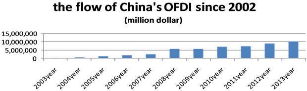 Recently, China’s Outward Foreign Direct Investment (OFDI) develops rapidly. “2014 World Investment Report” issued by United Nations Conference on Trade and Development (UNCTAD) shows that the global Foreign Direct Investment (FDI) flows in 2013 had achieved 1.41 trillion and the stock was 26.31 trillion. Respectively, China’s OFDI accounted for 7.6%, which ranked the third in flow and 2.5% which ranked the 11th in stock [1] . As you know, under the guidance of the strategy of “going out” and policy stimulus, Chinese enterprises constantly pour into overseas markets to seek opportunities.