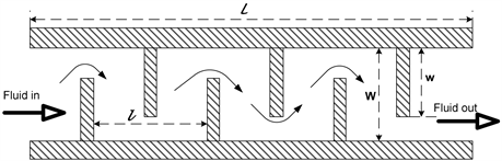 Figure 4. Schematic top view of collector with baffles. Length (L) = 1.2 m, length of baffles (w) = 85% width of collector and collector width (W) = 0.6 m.