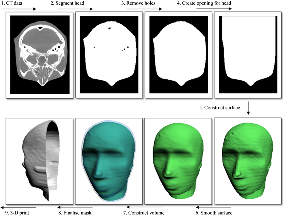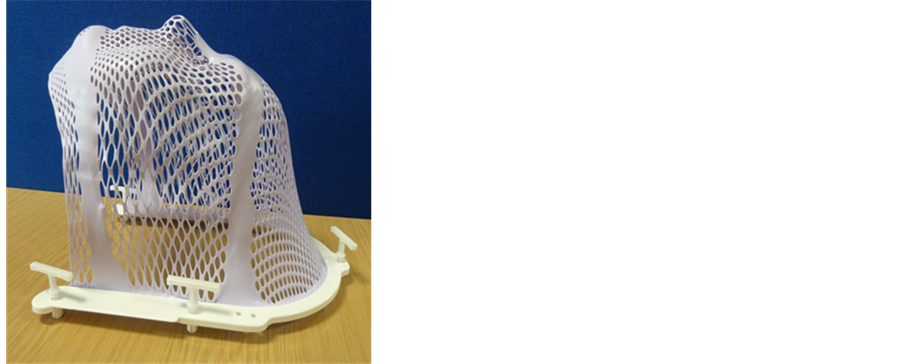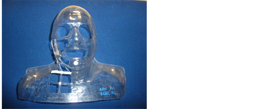 These are constructed either by directly draping heated thermoplastic over the patient’s face or by taking a plaster of Paris negative impression that is subsequently used to create a positive from which a polyethylene immobilization cast is vacuum formed. In either case, the process, which may need to be repeated to ensure that immobilization remains robust as treatment progresses, can be particularly distressing for patients. The Macmillan website describes the plaster of Paris process as potentially uncomfortable [3] , but in feedback questionnaires patients have described the process as horrific. Constructing masks is a skilled and time-consuming process that can delay the start of treatment. With recent developments in 3-D printing technologies the potential to generate an immobilization mask directly from a 3-D computer model of a patient comes. Typically, a patient requiring radiation therapy treatment will have had a CT scan and if a computer model of a mask could be obtained directly from the CT data it would reduce patient distress, reduce visits and possibly enable the patient to start their radiation therapy treatment sooner. A number of immobilization mask systems have been developed and technical specifications and methods of implementation vary considerably. High melting point thermoplastic systems prohibit target dislocations larger than 2 - 3 mm while lower melting point plastic meshes achieve set- up accuracies of between 4 - 5.5 mm [4] [5] . A margin of 3 - 4 mm is typically used when planning radiation therapy treatment to the head and neck to account for this uncertainty [6] .