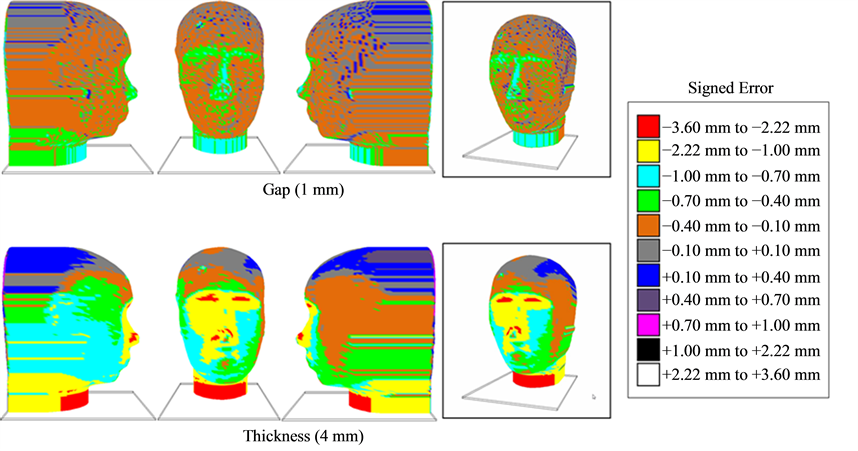 To evaluate the accuracy of the modelling process and to measure the variability in mask thickness, we have developed an error analysis tool. The tool renders the distance between the 3-D model of the patient’s head and the inner surface of the mask as a colour map (Figure 4). After printing the immobilization mask we rescanned the phantom once with and without the mask placed in position to assess the accuracy of the fabrication process and to evaluate the dilation process used to adjust the fit (Figure 5(a)). The CT slices were converted to binary images by applying a threshold value determined using Otsu’s method [14] (Figure 5(b)).