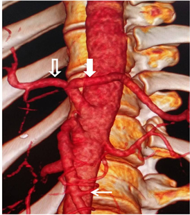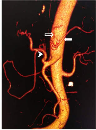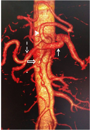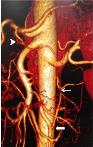 Figure 2. Enhanced abdominal CT-scan showing on 3D reconstruction, a hepato-splenic bifurcation with a common hepatic artery (hollow arrow), a splenic artery (full arrow) and a stomachic coronary artery of inferior mesenteric artery origin (thin arrow).