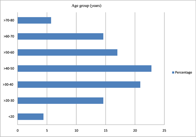 Our sample consisted of 160 patients, including 93 men and 67 women. The sex-ratio was 1.4 with ages ranging from 18 to 80 years for an average of 45.9 years. The most common age range was between 40 and 50 years as shown in Figure 1. The three most common indications for abdominal CT-scan were tumour extension assessment, assessment of abdominal pain and assessment of abdominal mass as shown in Table 1.