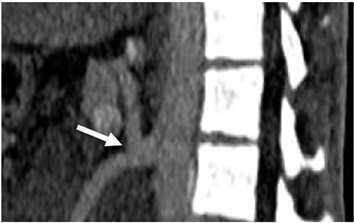 Figure 5. Enhanced abdominal CT-scan showing on 3D reconstruction a common celiac and mesenteric trunk (arrow).