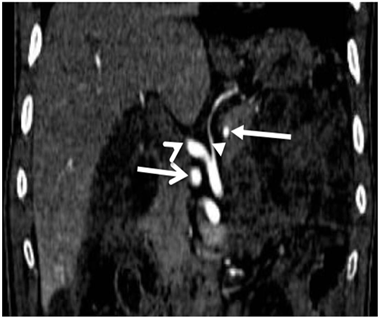 Figure 7. MIP image of enhanced abdominal CT-scan, in frontal section showing a quadrifurcation of celiac trunk, with a right hepatic artery (short arrow), a left hepatic artery (“delta wing”), a stomachic coronary artery (arrow head) and a splenic artery (full arrow).