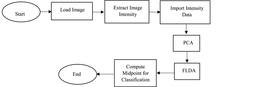 In acquiring the multispectral images of the of the Group A lens tissues, the 590 nm spectral band was used to adjust the camera settings with imaging parameters (i.e. the gain and the exposure time) for optimization. This spectral band was used as a standard due to the camera’s sensitivity. Grayscale images of each lens were captured in three modes (transmission, reflection and scattering) at all the 13 spectral bands and then saved as tagged image file format (TIFF). Thus, a total of 39 images were obtained for each lens. The image acquisition process was repeated for the Group B lens tissues. Pixel intensities of the images were extracted using Matlab codes for further analysis. A flow chart of the Matlab codes developed for pixel intensity extraction from the images, principal component and Fisher’s linear discriminant analysis is shown in Figure 1.