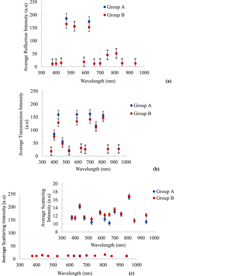 Since the discrimination between the two (2) groups, in transmission, reflection and scattering modes, cannot be easily assessed by observation of the grayscale images, their averaged pixel intensities in each mode were extracted and plotted are shown in Figure 3. The averaged reflected pixel intensity values from Group A and Group B lenses are shown in Figure 3(a). The figure shows that Group A lenses are much higher at three (3) specific spectral bands 470 nm, 525 nm and 625 nm than that of Group B lenses. Also, these three (3) spectra bands are higher (>150 a.u) in both the Group A and Group B lenses compared to the other spectral bands. This is an indication that the lenses do reflects light intensities but much higher from 470 nm, 525 nm and 625 nm. This can be attributed to the smooth, clear and glassy nature of the Group A compared to the rough