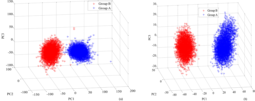 Figure 4. Scatter plot of the first three principal components of Group A and Group B lenses for (a) three transmission spectral bands (470 nm and 625 nm) (b) two reflection spectral bands (470 nm and 625 nm).
