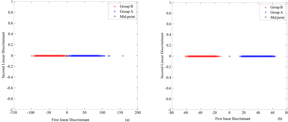 Figure 5. Group A and Group B lens data plotted in the coordinates of the first two Fisher’s discriminants (a) three transmission spectral bands (435 nm 590 nm and 700 nm) (b) two reflection spectral bands (470 nm and 625 nm). The black star represents the classification mid-point (m).