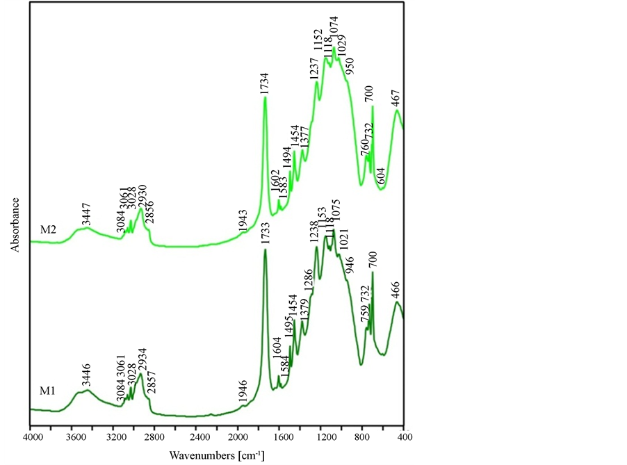 Fourier spectroscopy in infrared is useful for complex identification a type of matrix using to connect conglomerate of fibers on structure elements. IR spectrum view describes material of matrix in Figure 7 [4] .