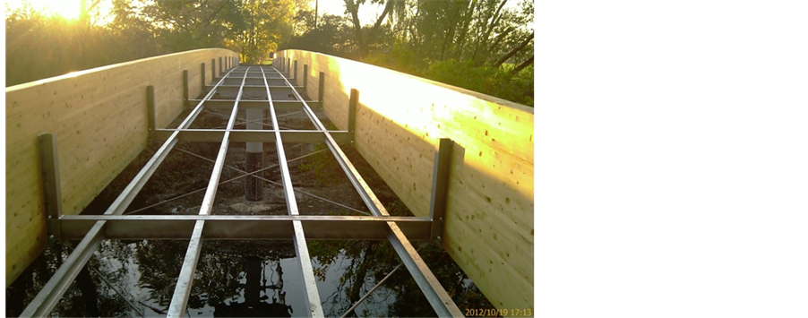 The use of fiber composites has great potential in bridge building [4] . The possibility of pre-assembling in the hall allows for rapid installation on site, low costs of maintenance, durability are very promising. For example in 2011 Karrebaksmide Bridge in Denmark with GFRP deck and steel main structure of moving span was con- structed. Germanic Hesen bridge with GFRP deck by Fiberline ASSET 600 system was erected in 2008 (Figure 15). Many steel footbridges with light GFRP deck were built in Denmark and Nederland, some of road bridges, in this system, were made in Great Britain, USA, Canada [4] . Traditional bridge decks are heavy and have poor durability but effective connection systems and better durability of pavement (by polymer concrete), which co- vered GFRP deck, at road bridge structures are very important directions in searching scale. GFRP deck is good alternative for old steel bridges, which need to exchange heavy old deck. Imposing strength values and fatigue parameters and all material properties (Table 4) [8] of glass fiber polymer give possibilities of modern shape of bridge structures using long-life material and coexistence traditional main part of bridge―steel girders with light, anticorrosion deck. Bridge engineering creates new directions in composite materials applications by strength parameters investigation. There are GFRP bridge deck panels for using in bridge structures with long durability. The capacity of GFRP is determinate by glass fiber’s pultruted direction in polymer matrix.