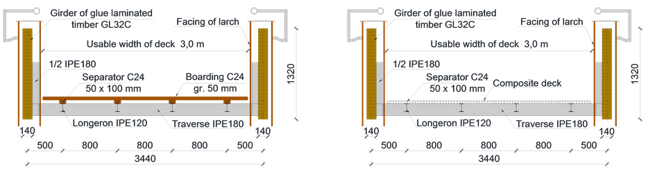 Figure 10. Two conceptions of footbridge deck using wooden panels (left) and GFRP panels (right).