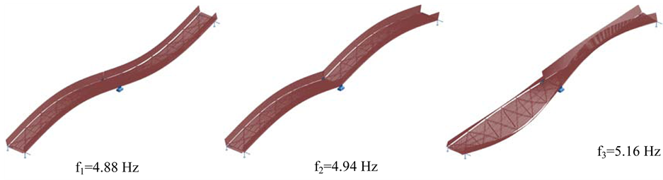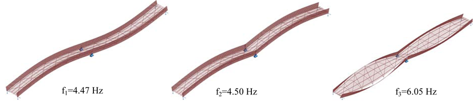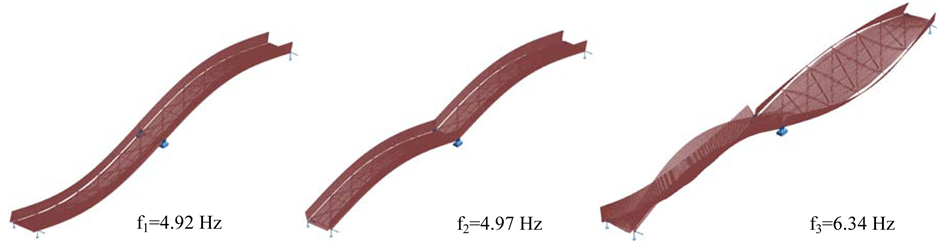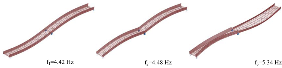 Figure 11. Identified the 1st three modes for footbridge with GFRP deck.