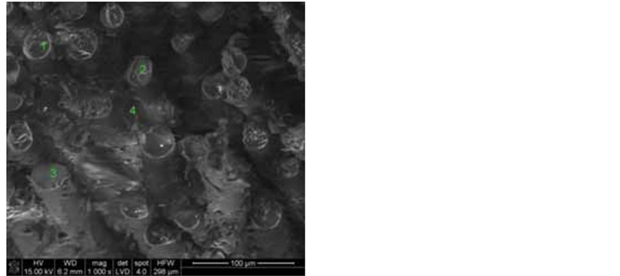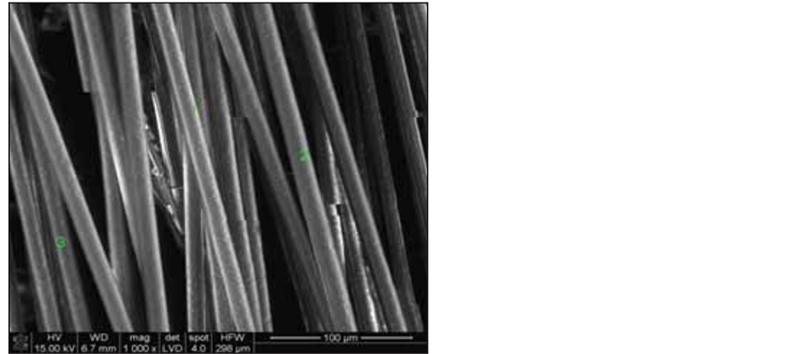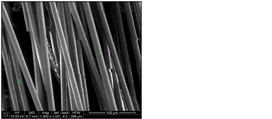 According to thermal analysis DTA and research of chemical content the main conclusion has been investigated, is that glass fiber is ECR type of glass. As complementary research EDAX analysis has been used for single fiber (Figure 3). Observation of morphology, surface of fiber and configuration has been possible using scanning microscope SEM. The isolation fibers by scanning analysis have been showed as number 1, 2 and 3