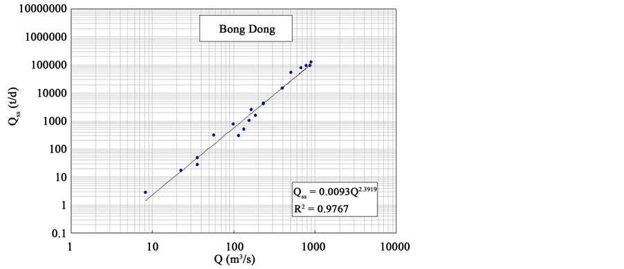 In this study, a discharge-suspended sediment load rating curve and a discharge-total sediment load rating curve were developed as shown in Equation (1) using the suspended load and hydraulic data measured at each survey line of the river section and the discharge data calculated from the stage-discharge rating curve developed in 2008.