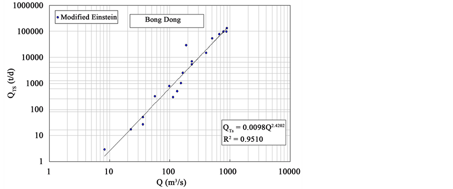 In this study, bed load was not measured, and thus, a discharge-total sediment load rating curve was developed using the suspended load and bed material that had been directly measured in the field. The estimated total sediment load value used for the discharge-total sediment load rating curve was the value based on the modified Einstein method, and the results were shown in Figure 9.