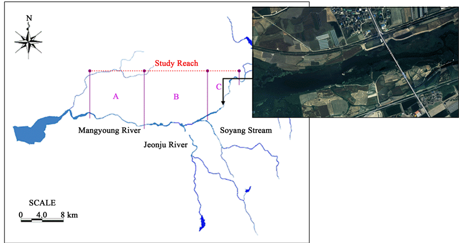 The Mangyeong River is a river that originates from Mt. Wondeung in Dongsang-myeon, Wanju-gun, Jeollabuk-do; meets the tributaries such as the Gosan Stream, the Soyang Stream, and the Jeonju Stream; and flows into the Yellow Sea. It has a basin area of 1527.1 km2, and a river length of 77.4 km. The bed slopes of the Mangyeong River are 1/3,800 at the 30 km downstream section of the Mangyeong River, 1/540 up to the 50 km midstream section, and 1/120 at the upstream section. For the Soyang Stream and the Jeonju Stream, the bed slopes are about 1/360 and 1/700, respectively. Thus, in most sections excluding the downstream section of the main stream of the Mangyeong River, the slopes are relatively steep. The bed of the main stream of the Mangyeong River at the downstream section of the confluence with the Jeonju Stream consists of silt and clay; and the beds the upstream section and the Soyang Stream/the Jeonju Stream consist of sand and gravel. Most flood plane in riverside land is used as farmland. The shape of the basin is close to dendritic (Figure 1, MOCT [1] ).