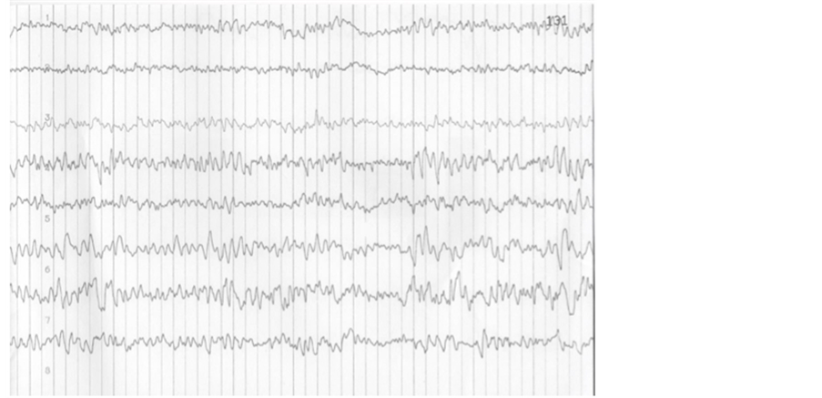 Figure 3. Patient 1: Routine EEG performed 3 days postictally after receiving 300 mg de DPH, shown diffuse irregular theta-delta activity, spike-wave, and sharp-wave discharges.