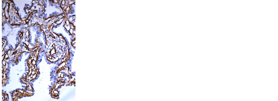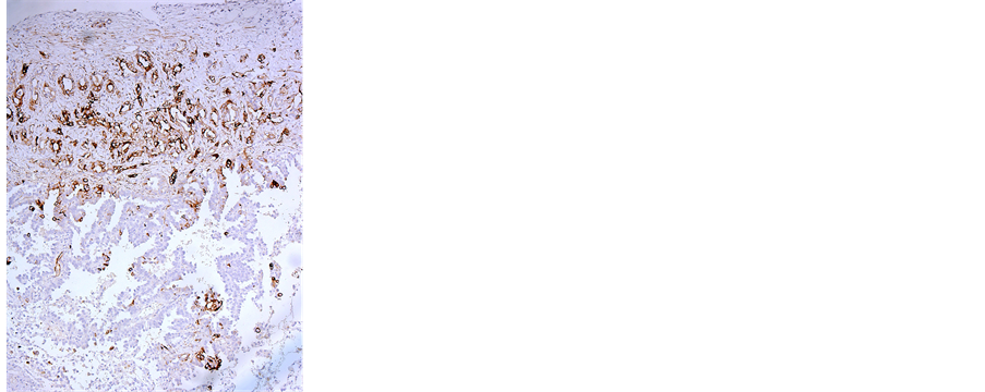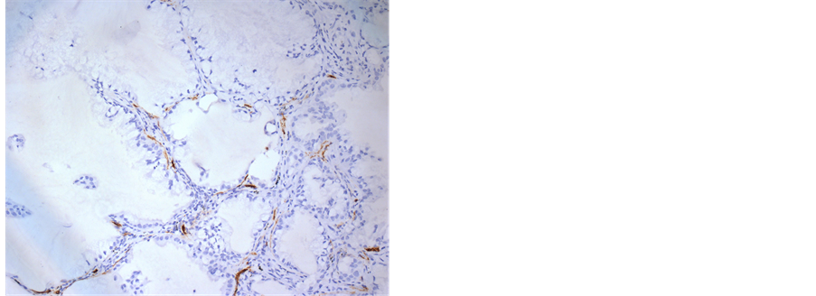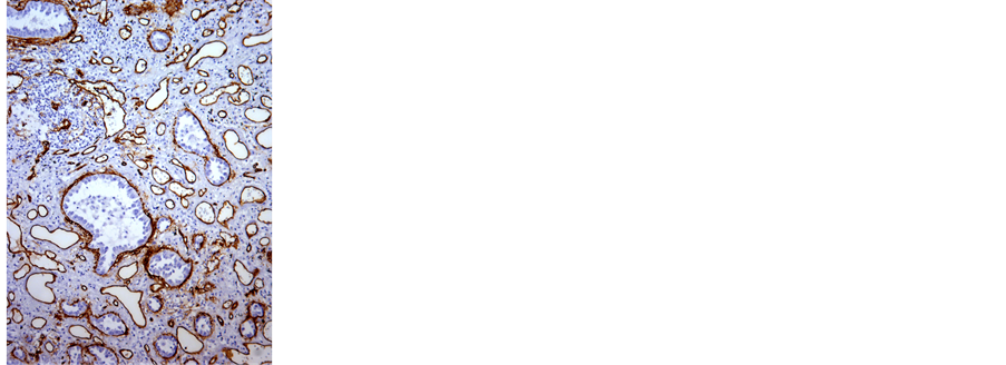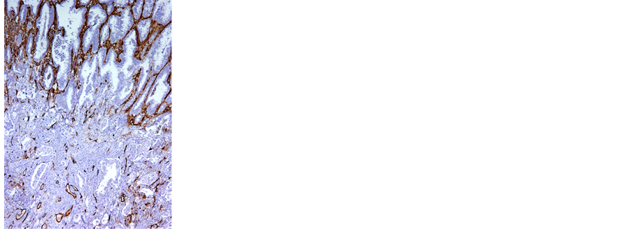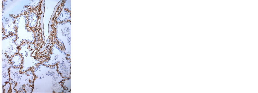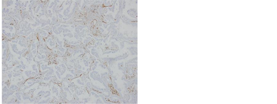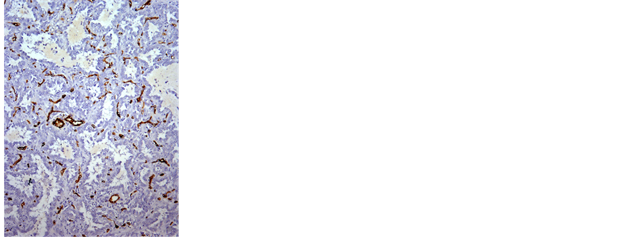 For the staining of Collagen IV-Laminin, immunohistochemistry was used. Both AAH and AIS had complete basement membranes, while AIS had significantly thickened basement membranes. Adherent adenocarcinoma of MIA and IA showed significantly thickened basement membrane surrounding. Non-invasive alveolar carcinoma of MIA and IA was surrounded by basement membranes, while invasive alveolar carcinoma was not surrounded by basement membranes. Other invasive cancers such as papillary adenocarcinoma, micropapillary adenocarcinoma, solid adenocarcinoma and invasive mucinous adenocarcinoma were not surrounded by basement membranes. After comparing with CD34 staining images, the basement membranes of tumor tissues had expression of CD34 (Figure 1(c) and Figure 4). These results suggest that AAH, AIS and the AIS component of MIA are surrounded by basement membranes with positive expression of Collagen IV-Laminin, AIS and the AIS component of MIA have significantly thickened basement membranes, and none of invasive adenocarcinomas is surrounded by basement membranes.
