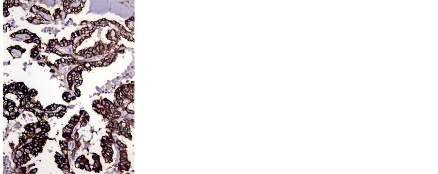 Treatment strategies for lung adenocarcinoma at different stages are different, and the pathological staging of lung adenocarcinoma has great significance in the clinical treatment and prognosis of the disease. Noguchi et al. show that adenocarcinoma in situ (AIS) may develop into invasive adenocarcinoma (IA), which is characterized as Noguchi type A (simple adherent growth), Noguchi type B (adherent growth with stromal hyperplasia and alveolar collapse), and Noguchi type C (adherent growth accompanied by local infiltration and stromal hyperplasia) [1] . According to lung adenocarcinoma classification agreed by 2011 International Association for the Study of Lung Cancer, American Thoracic Society, and European Respiratory Society (IASLC/ATS/ERS) meeting, the staging of lung adenocarcinoma is conducted by morphological properties after hematoxylin and eosin staining [2] - [4] . However, some problems usually occur in the practical applications of these diagnostic standards. For example, there are no clear morphological boundaries for the transitions among adherent growth, alveolar growth, and invasive growth for Noguchi type C [5] . The development of adherent growth into cluster growth, simple nipple growth, nipple-like growth, and micro nipple-like growth may be a continuous progress [6] . However, cluster growth can also directly develop into micro nipple-like adenocarcinoma [7] [8] . Therefore, it is difficult to identify early invasive foci of lung adenocarcinoma using only hematoxylin and eosin staining.