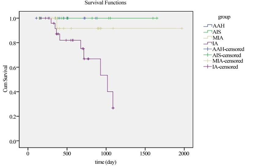 To determine the tumor-free cumulative survival rate, 233 patients were followed up in 3 - 85 months after the surgery and the data were analyzed using Kaplan-Meier method. The recurrence and metastasis rate for AAH group was 0/40 (0%); that for AIS group was 0/51 (0%); that for MIA group was 1/88 (1.14%); and that for IA group was 20/54 (37.04%). Statistical analysis showed that the survival rate of IA group was significantly lower than those of AAH, AIS and MIA groups (P < 0.05) (Figure 5). The result indicates that invasive adenocarcinomas result in the lowest cumulative survival rate among all groups.