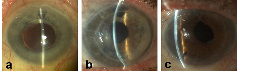 Figure 3. Attached and clear grafts at a 12-month follow-up period in a patient with AC-IOL and a large anomalous pupil (a), a case of prior failed PK in the presence of AC-IOL (b) and a patient with glaucoma drainage device (c).