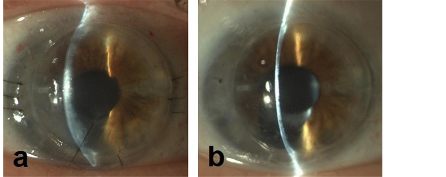 Figure 4. Postoperative partial peripheral graft detachment due to graft folds, accompanied by mild corneal edema in a second (redo) DSEK case with a history of failed DSEK and failed PK (a). Spontaneous reattachment and edema resolution after suture removal (b).