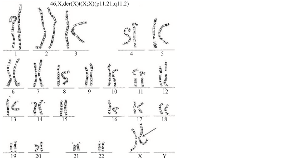 Figure 1. Karyotype results from our patient showing the 46, X, der (X) t (X; X) (p11.21; q11.2) pattern. The arrow indicates the deletion of the short arm and the duplication of the long arm.