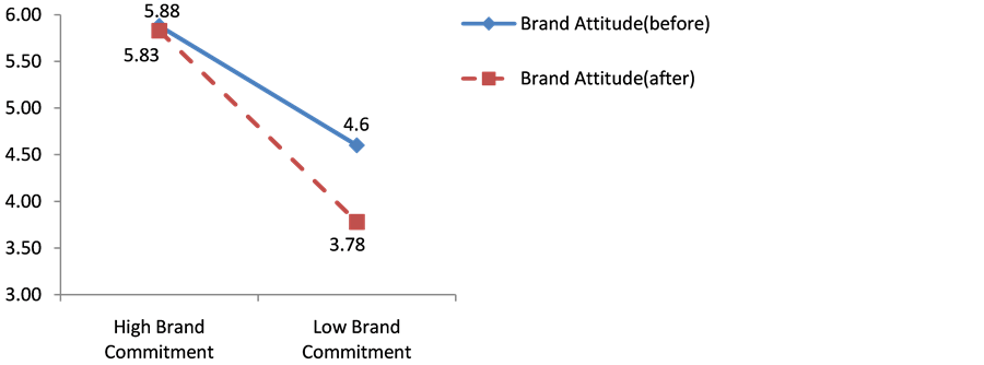 As shown in Figure 2. After reading the conflicting information, brand attitude of consumers with high brand commitment changed little (MHA = 5.88, MHB = 5.83, T = 1.416, p = 0.163 > 0.05), but brand attitude of consumers with low brand commitment declined significantly (MLA = 4.6, MLB = 3.78, T = 7.476, p = 0.000 < 0.05). So H2 and H3 were supported.