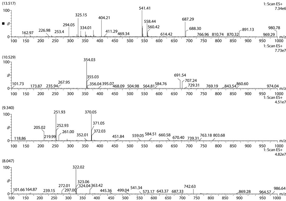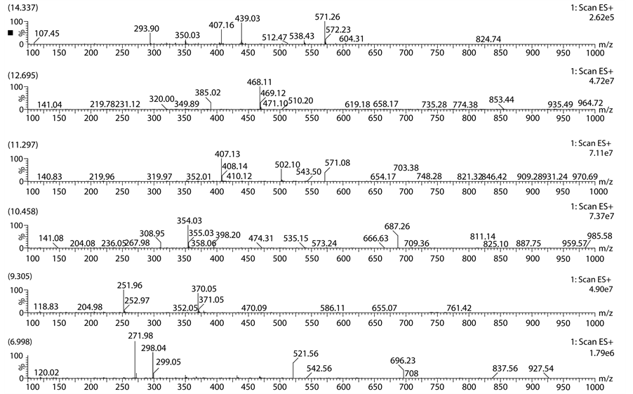 Sample was analysed on the waters micro mass Q-TOF equipped with ESI ion source. Sample was analysed in positive mode. Leucine enkephalin (m/z: 555.62268 Da) was used as internal standard to calibrate the mass range and mass accuracy. Data was acquired in positive mode using Masslynx software.