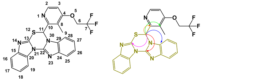The numbering scheme for the NMR assignments and HMBC correlation for critical singlet proton at 7.914 ppm are shown in Figure 8. The 1H NMR, 13C NMR spectral data of degradation product was compared with those of Lansoprazole. In 1H NMR, one set of ?CH2 (Methylene) group protons in Lansoprazole are missing in degradation product. As well, in 13C NMR one set of ?CH2 (Methylene) group carbon in Lansoprazole missing in degradation product. NMR chemical shifts and 2 D NMR (HSQC, HMBC Correlations) of base degradation pro- duct are shown in Table 3. In NOE study, while irradiating proton chemical shift at 7.914 (Label 11) enhancing signals which are spatially closed signals of methyl protons (Label 9) and aromatic proton (Label 28). It clearly indicates presence of benzimidazoles substituted [1,3,5] Thiadiazine. (HMBC, HSQC, NOE and all other NMR data enclosed in supplementary data). 1H NMR spectrum, 13C NMR spectrum, purity chromatogram of degradation product of Lansoprazole and COSY correlation spectrum were shown in Figures 9-12.