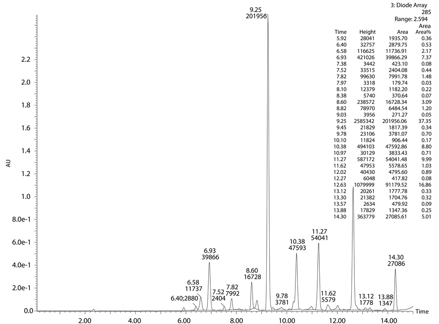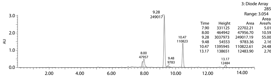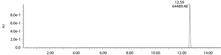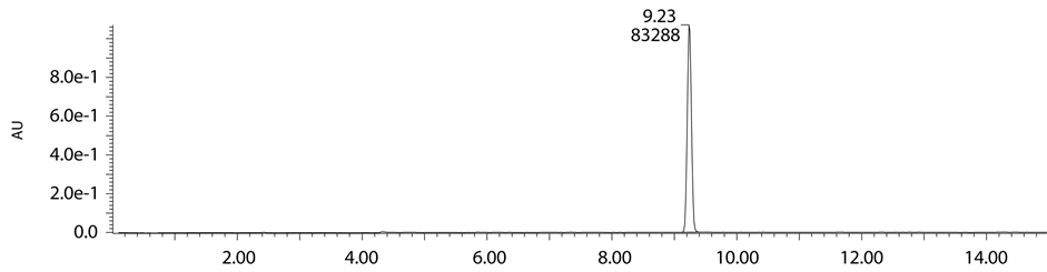 Acid degradation studies were carried out as per the guidelines of ICH. 200 mg of standard drug was refluxed with 0.1 N HCl solution at 60˚C for 8 h to study acidic degradation. Normality of acidic solution increased gradually from 0.1 N to 2 N to achieve sufficient degradation. For analytical study, the resultant acid degrada- tion sample was dissolved in methanol and diluted with mobile phase and 10 µl injected into the system and the chromatograms were recorded to assess the stability of the sample.
