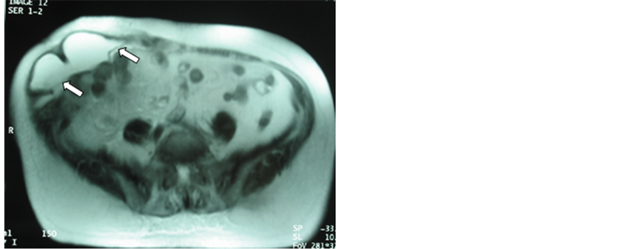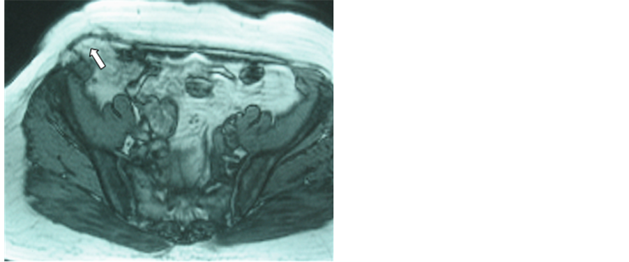 Figure 3. One month postoperative axial MRI control after laparoscopic surgery on a middle-right flank incisional hernia. The arrow shows the mesh. The seroma appears both under the skin and inside the abdominal cavity.