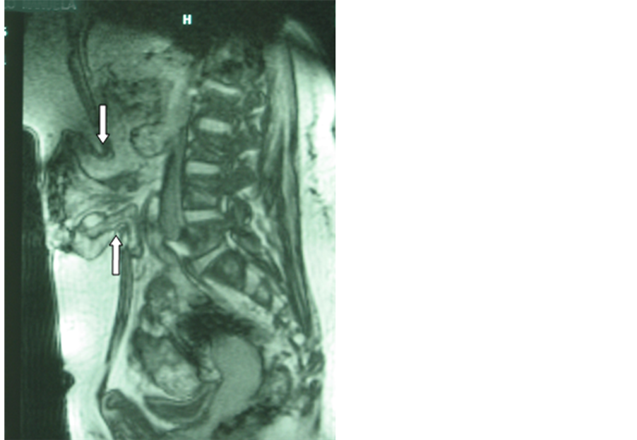 Figure 1. Preoperative MRI: sagittal view of a large incisional hernia. The arrows show the edges of the abdominal wall defect.