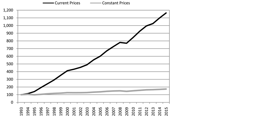 That procedure allows GDP figures to be as close as possible to the real physical growth of domestic production. In Figure 2 we see that the slope of GDP at constant prices―in deflated figures to the base year 2008―is much lower than the one of current prices and shows the real growth of our economy that in 27 years has only been able to increase 74% while GDP at current prices increased 1064.5% in the same period, due to the high cumulative inflation especially during the first 10 years.