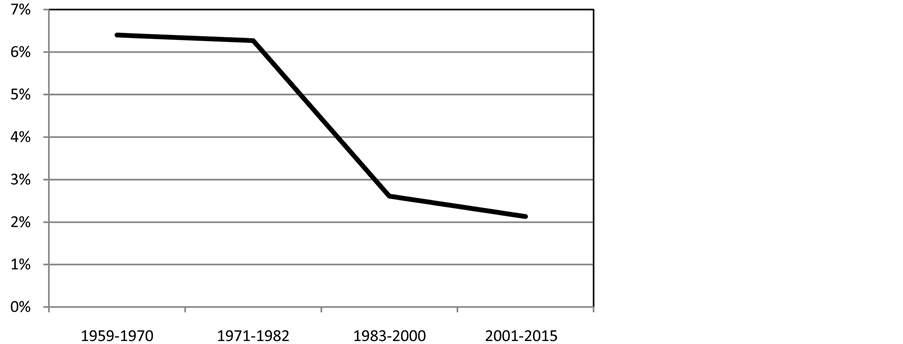 Table 6 shows the average annual growth rate of real per capita GDP reached in the period 1959-2015: 1.83% per annum. When analyzed in each of the periods we observe its downward trend. From 1959 to 1970 the real grow this 3.26%―the real GDP per capita would have doubled in 21 years if this rate had been preserve. From 1971 to 1982, it was 3.4%. From 1983 to 2000 it falls strongly to 0.58%―120 years to double. From the so called political transition there is not a recovery according to the expectations of neoliberalism: 0.95% per annum, 74 years to double the standard of living or, what is the same, three generations.