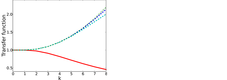 Figure 3. Transfer function of filter (red, solid line), approximate deconvolution of fifth order (blue, dashed line), approximate deconvolution of third order (cyan dashed line) and exact filter inverse (green, dash-dotted line).