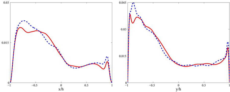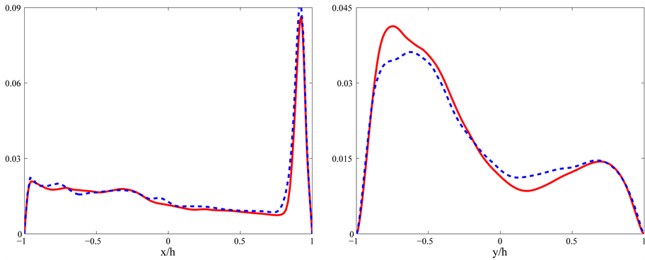 Figure 9. Comparison of DNS (solid, red line) with UDNS (dashed, blue line) in mid-plane