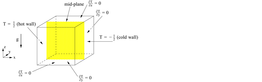 In this case the geometry is a cube where all walls are fixed. The flow is generated by a temperature difference between the hot left side wall and the cold right side wall. All other walls are insulated. Figure 2 displays the problem set-up and the geometry. The cavity is given in non-dimensional coordinates by