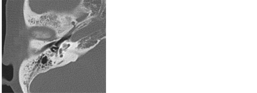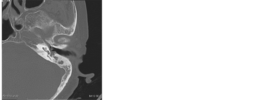 Case 1. A 53-year-old female was referred to our hospital for the investigation on progressive bilateral senso- rineural hearing loss. Thirty years previously, she had been diagnosed with bilateral chronic otitis media (COM). She was also diagnosed with chronic sinusitis without nasal polyposis, and she had been treated with steroid inhalation therapy for bronchial asthma. At the age of 49, bilateral profound sensorineural hearing loss was detected. On pathological examination, the middle ear mucosa contained numerous eosinophils and she was diagnosed with EOM according to the 2011 diagnostic criteria [6] . Pure tone audiometry showed bilateral profound hearing loss (Figure 1). Her speech recognition score was 10% (Japanese monosyllable list) in both ears. Temporal bone computed tomography (CT) and magnetic resonance imaging (MRI) showed no low density tissue in mastoid or tympanic cavities (Figure 2(a)). No ossification of the cochlea was evident (Figure 2(b)). As she did not present with any ear discharge, we recommend cochlear implantation. After systemic administration of a corticosteroid (dexamethazon 2 mg/day × 7 days), we performed cochlear implantation through the round window approach with miryngoplasty in her left ear. As no ossification of the cochlea was observed, flex electrode arrays (Med-EL Flex28) were used and inserted completely. No complications in relation to the implant device or skin flap were observed during a three-year follow-up. In spite of postoperative oral steroid administration, the tympanic membrane was re-perforated and ear discharge recurred at six months post-surgery (Figure 3). Even