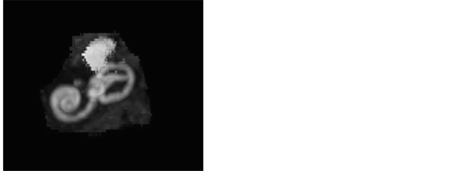 Case 2. A 65-year-old female was referred to our hospital for the investigation on progressive bilateral sensorineural hearing loss. She had been diagnosed with bilateral COM 12 years previously and she had been suffering from ear discharge. She had also been treated with oral steroid therapy for bronchial asthma. She was also diagnosed with chronic sinusitis with nasal polyposis. The middle ear viscous discharge contained numerous eosinophils and she was diagnosed with EOM according to the 2011 diagnostic criteria [6] . Temporal bone CT showed low density areas in the mastoid and tympanic cavities but MRI showed no ossification of the cochlea (Figure 4(a), Figure 4(b)). In spite of anti-IgE therapy in combination with oral steroids, an anti-histaminergic agent and leukotriene receptor antagonist administration, her hearing threshold was gradually deteriorated, and she developed bilateral profound hearing loss at the age of 70 (Figure 5). Her speech recognition score was 20% (Japanese monosyllable list) in both ears. As the middle ear discharge was persistent, we decided not to perform the cochlear implant at that time. 3 years later, she insisted on receiving a cochlear implant since she could not hear at all with hearing aids. The electrode array (Med-EL Flex28) was inserted into the scala vestibule in her left ear as ossification of the scala tympani was found during the surgery. Myringoplasty was also performed in her left ear. No complications in relation to the implant device or skin flap were observed during a two-year follow- up. In spite of postoperative oral steroid administration, the tympanic membrane was re-perforated and ear discharge recurred three months post-surgery (Figure 6). Her speech recognition score was 20% (Japanese monosyllable list).