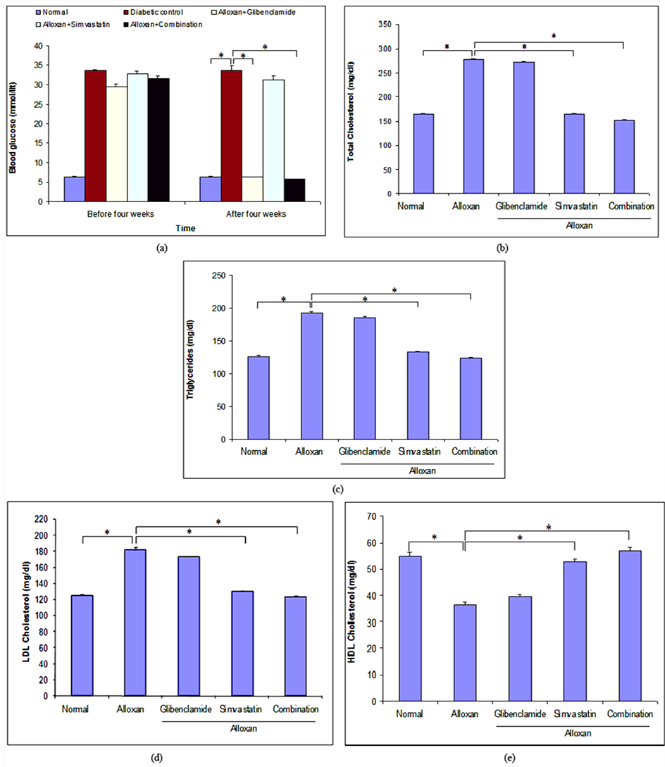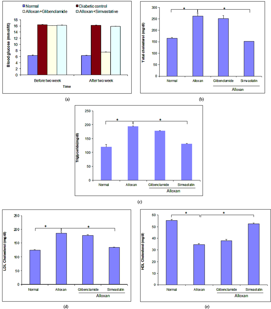 Figure 1. Effect of glibenclamide and simvastatin for two weeks on blood glucose level and lipid profile in short-term alloxan-induced diabetic rats. (a) Blood glucose level was estimated after two weeks treatment with glibenclamide and simvastatin in alloxan-induced diabetic rats; (b)-(e) represented the estimation of TC, TG, LDL and HDL-C levels, respectively. All values were presented as mean ± SEM; n = 6 in each group, *p < 0.05 compared to alloxan-induced diabetic rats (ANOVA followed by Dunnett’s test).