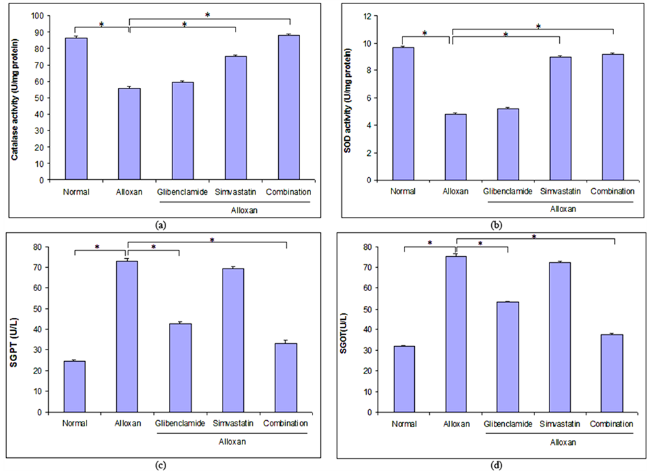 It has been reported that in diabetic rat superoxide dismutase (SOD) and catalase enzyme activity were usually decreased [22] . It is widely estsblished that hyperglycemia increased oxidative stress [23] and oxidative stress was responsible for the CVD. Free radicals can cause damage to cardinal cellular components such as lipids, proteins, and nucleic acids (e.g. DNA), leading to subsequent cell death. The present study revealed that induction of alloxan in rats for long term significantly decreased antioxidant enzyme (SOD and catalase) activity in comparison with normal rats. Treatment with combination therapy significantly increased these enzyme activities in alloxan induced diabetic rats. Simvastatin alone also significantly increased antioxidant enzyme (SOD and catalase) activity whereas combination therapy showed more significant effect than simvastatin alone. On the contrary, glibenclamide had lack of significance in increasing antioxidant enzyme (SOD and catalase) activity compared with ARDs.