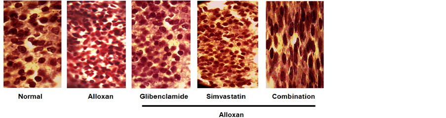 Injection of alloxan in rats significantly shrunk Islets of Langerhans in comparison with normal rats [26] . In our study, the pancreas demonstrated marked shrinkage of Islets of Langerhans cells by the induction of alloxan in comparison with normal rats. Administration of glibenclamide recovered Langerhans cells from shrinkage which was demonstrated earlier where as simvastatin also displayed little recovery of the cells. But in case of combination therapy, noticeable recovery of Langerhans cells was reported.