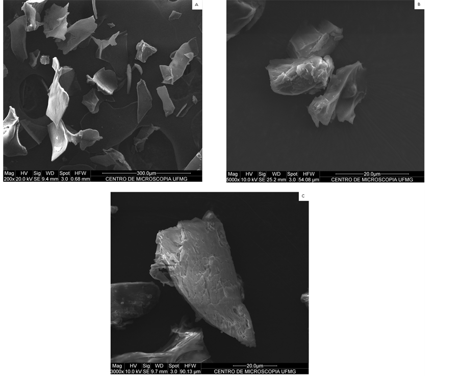 By scanning electron microscopy, we observed a reduction in the presence of starch granules after the extrusion process, with the product having a more amorphous and compact structure after starch gelatinization.